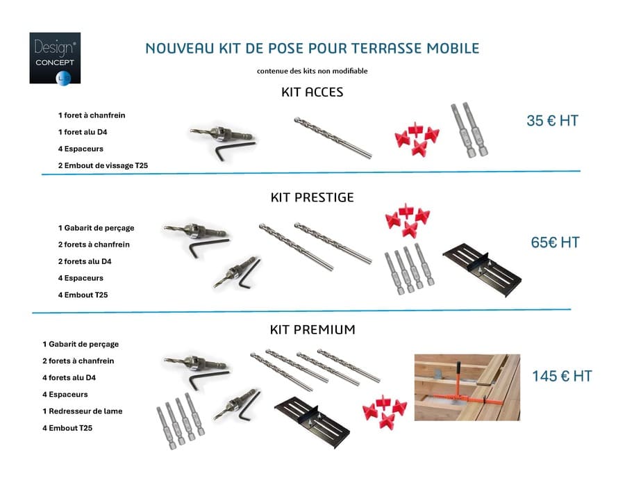 DCLS propose des packs d’outillage adaptés. A l’intérieur, vous trouverez tous les éléments spécifiques nécessaires pour le montage de votre terrasse mobile en kit.